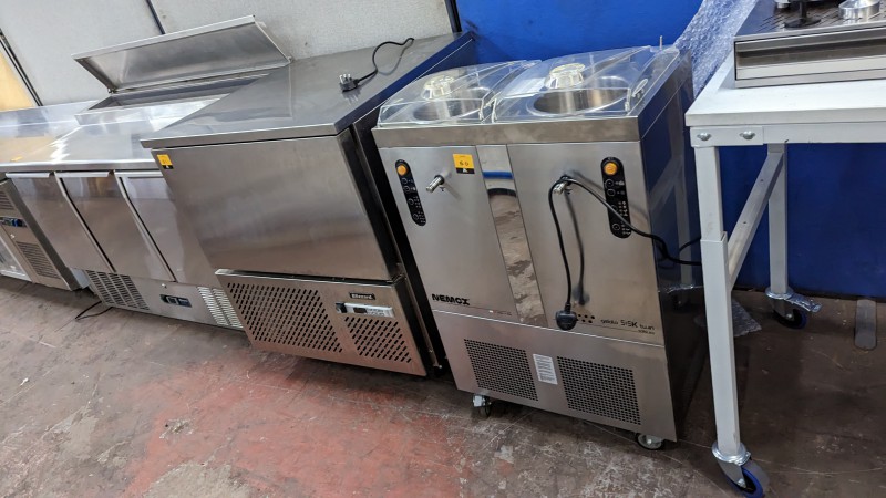 Also Bean to cup and traditional coffee machines, coffee bean grinders, slush drinks machine, Nemox 5K twin compartment Gelato machine, multi ring gas ovens, combination ovens, microwaves, over head grills / salamanders, fryers, glasswashers, dishwashers, warming units, ice machines, stainless steel tables/shelving/trollies/basins/etc, utensils, gadgets, pots, pans, trays, containers, good quantity of restaurant tables & chairs and much more